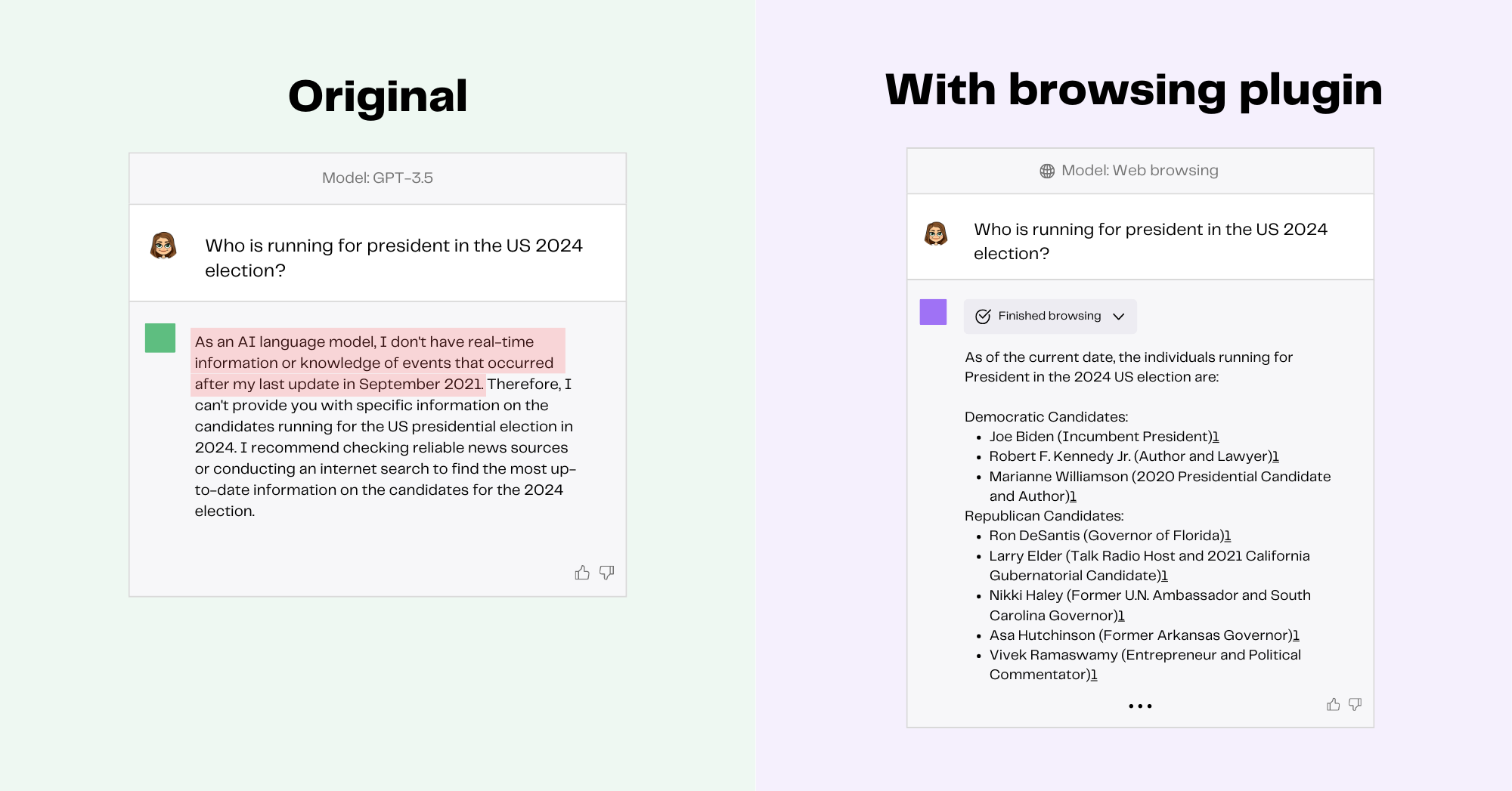 - Plugins lack human judgment. ChatGPT’s Browsing Mode and other plugins that connect users to real-time data are searching the internet for us, effectively “clicking” on links and scanning those web pages for relevant information. This can’t replace the judgment of a human because we don’t know the decision-making process behind how sources are chosen or prioritized.