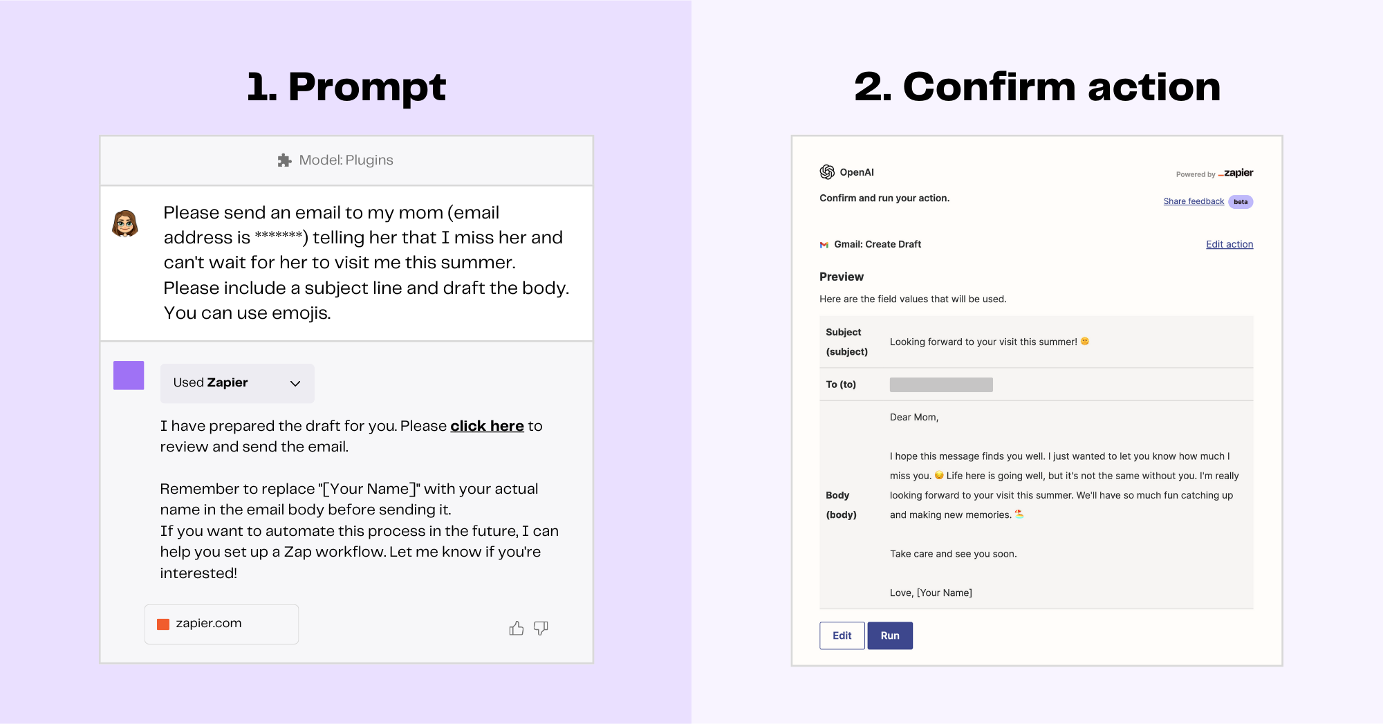 Incorporating LLMs into digital task automation workflows can lead to even more effective and personalized automation of common tasks. Here’s what happens when we use the Zapier plugin and ask ChatGPT to write an email to my mom. To complete this task, ChatGPT asks Zapier (which is already connected to my Gmail account) to draft an email with all the relevant information (topic, recipient, tone) provided in the prompt. Zapier completes the task, using the ChatGPT language model to generate all the necessary text, and provides a link that allows me to review and send the draft directly from my Gmail account.