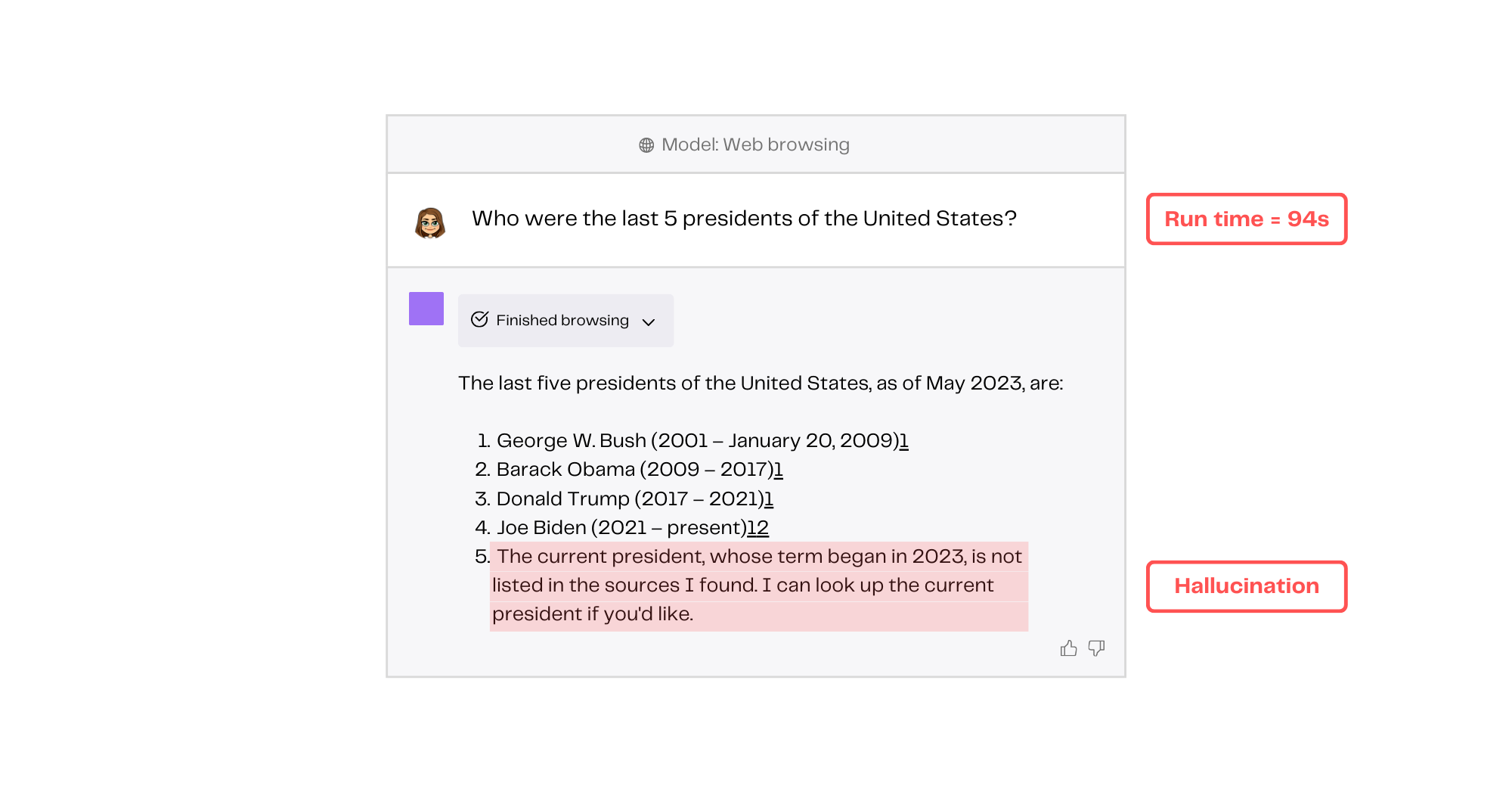 Perhaps the most concerning aspect of this response is that the imaginary papers sound totally plausible. They are even attributed to well-known authors in the field. This is called hallucination and it’s one of the most serious flaws of LLMs. While there are several machine learning methods that can reduce hallucination in LLMs, enabling these models to connect to data sources through the use of plugins is a lower-cost way to increase accuracy and further expand the capabilities of LLMs.