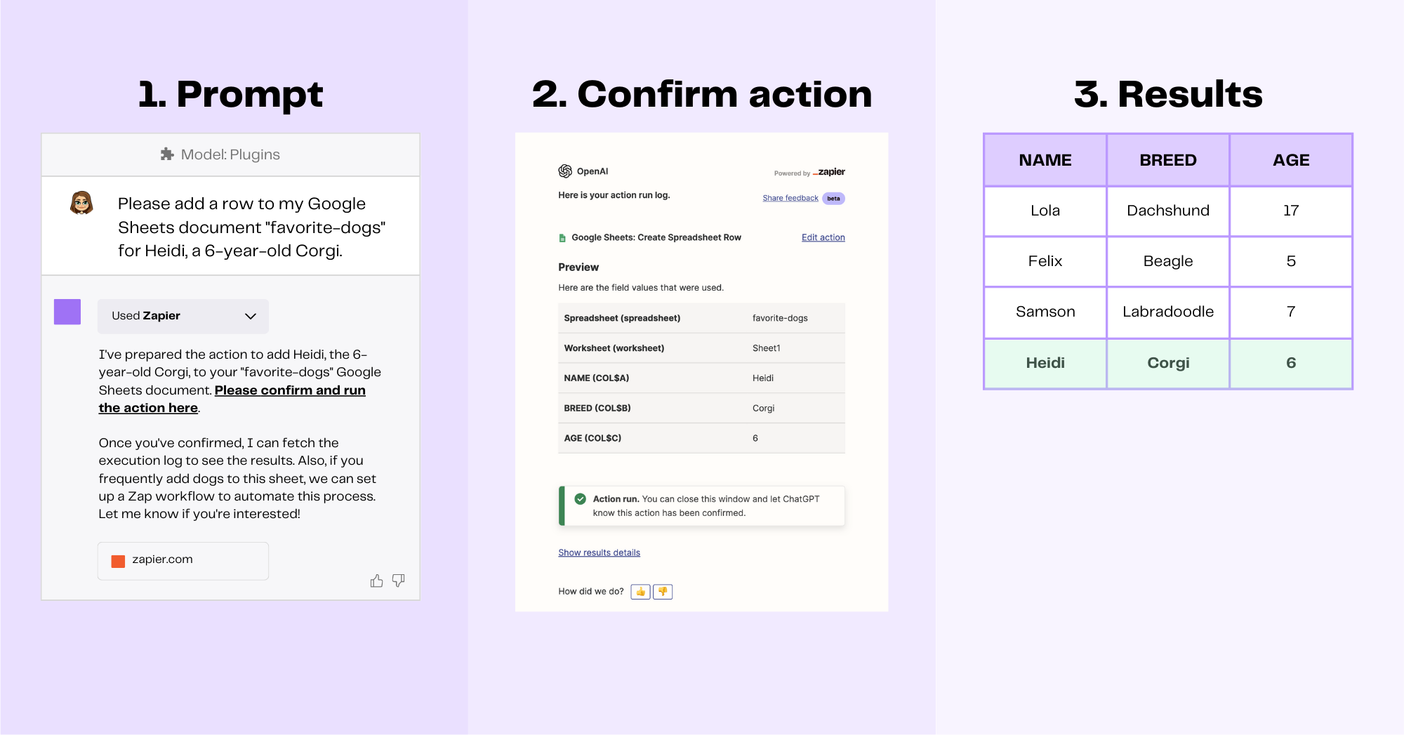 In a previous example, I showed how to use Zapier to draft a personal email. Now, let’s use the plugin to add automatically add new data to an existing Google Sheets document. For simplicity, let's say the spreadsheet holds the names, breeds, and ages of all my favorite dogs. After installing and enabling the Zapier plugin, all I need to do is tell ChatGPT in plain English to add data to an existing Google Sheet called "favorite-dogs." Next, I click on the link provided in the response, confirm that ChatGPT understood my request correctly, and confirm the action. When I open my "favorite-dogs" document, I'll see that the data was added.
